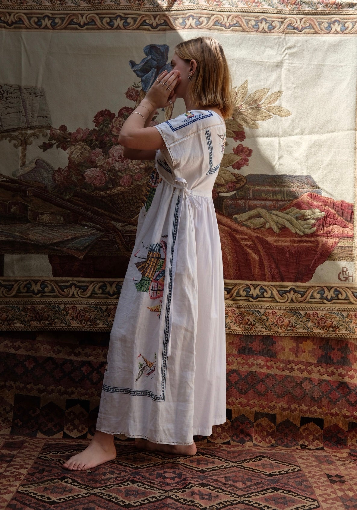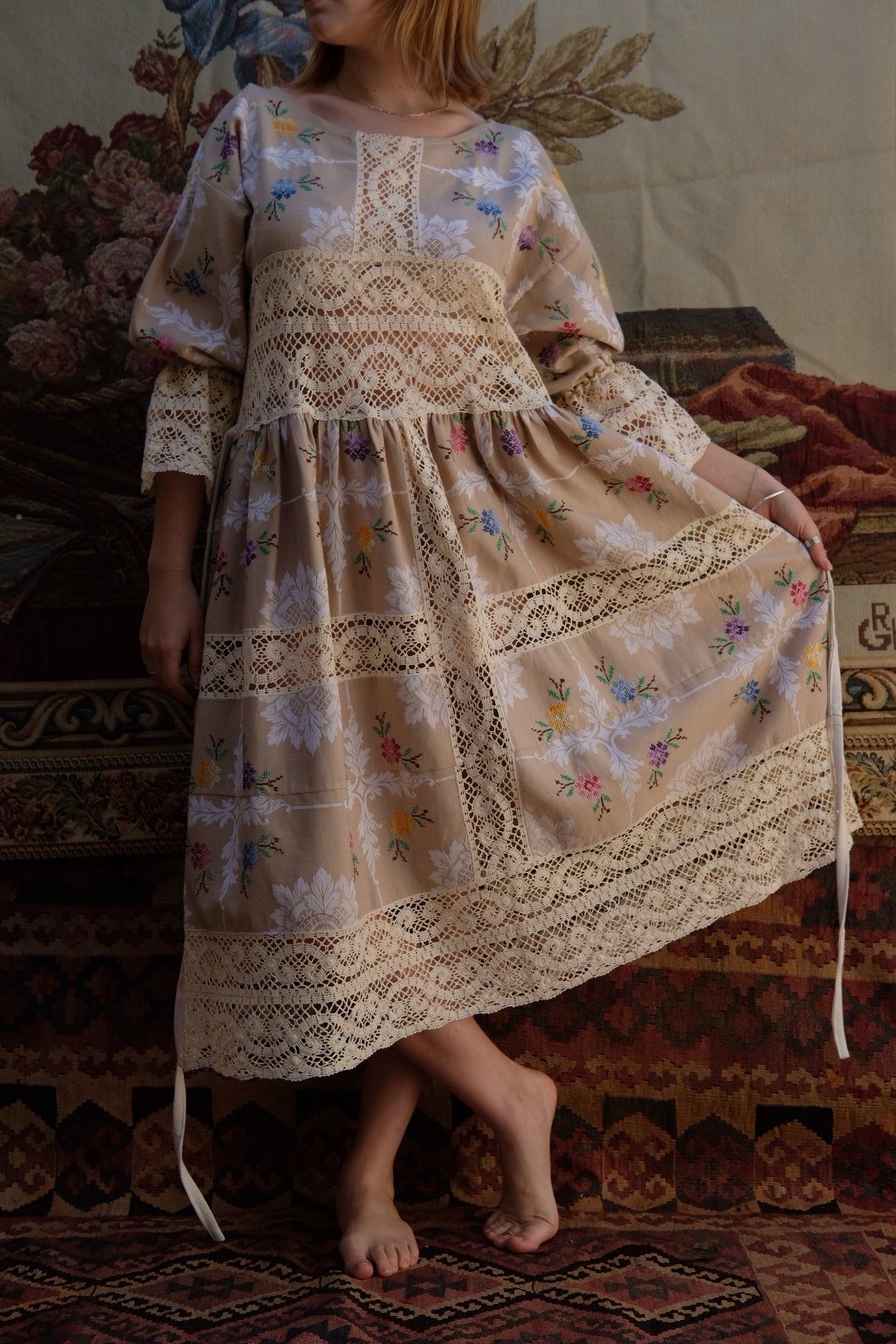 Every piece starts with a vintage tablecloth, often hand-embroidered years—even decades—ago. Sometimes we struggle with how to use it, but in those moments, we remind ourselves: the fabric is the heart of the dress. We adapt our patterns to suit the material, not the other way around. If a tablecloth is large, the resulting dress is large—and beautifully so. With adjustable side ties, our dresses can often fit from a size 8 to a size 18. We never cut a tablecloth down just to fit a certain size. Instead, we use every last scrap, honoring the fabric and its story.
