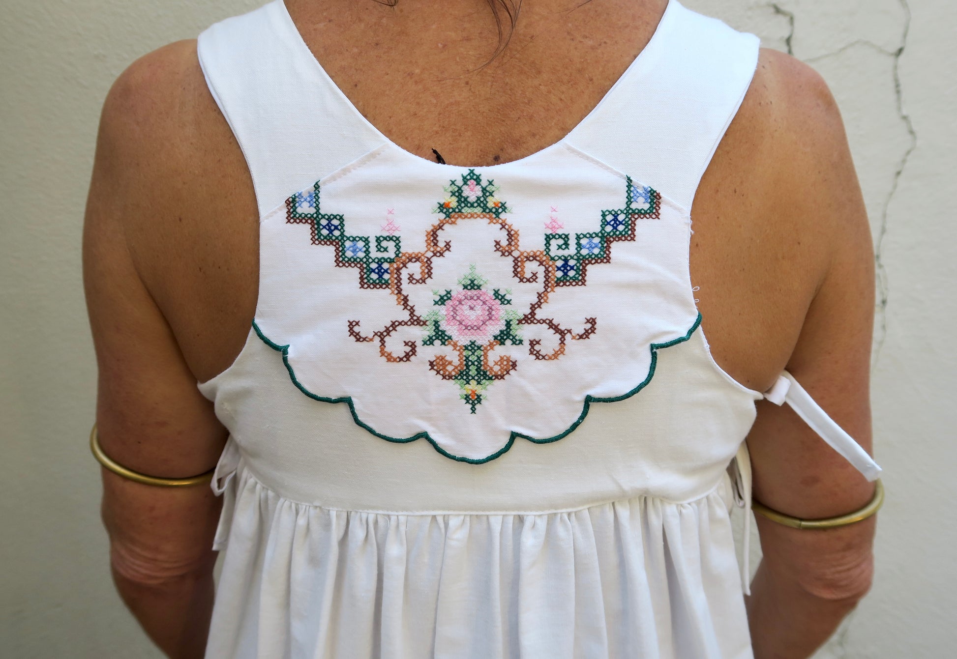 The Cross Stitch Milkmaid dress is made from 100% cotton. The bodice is made from a vintage oval tray cloth with handmade cross stitch embroidery. She also has two embroidered front pockets and cotton ties under the arms as well as crochet trim on the front of the dress.