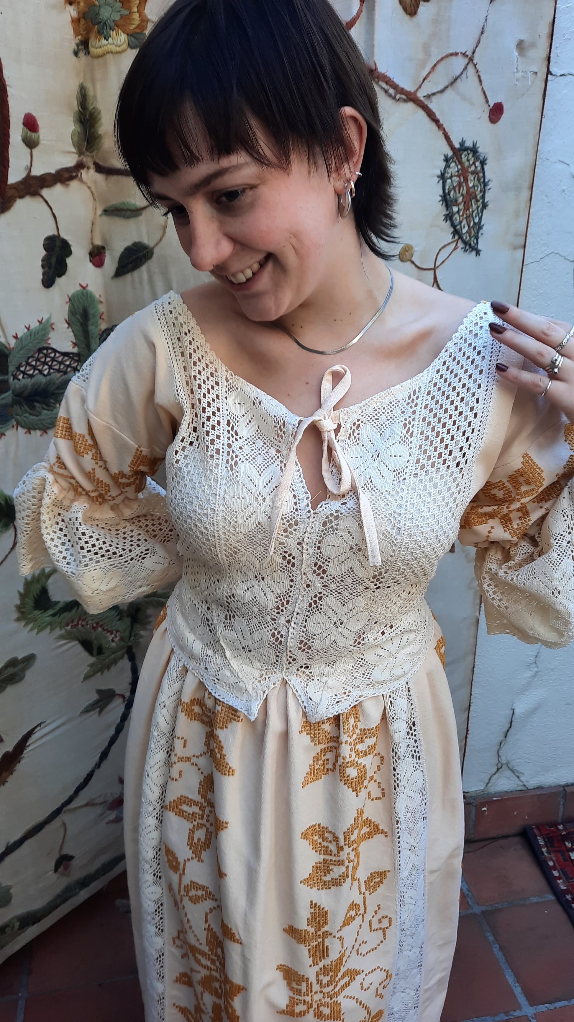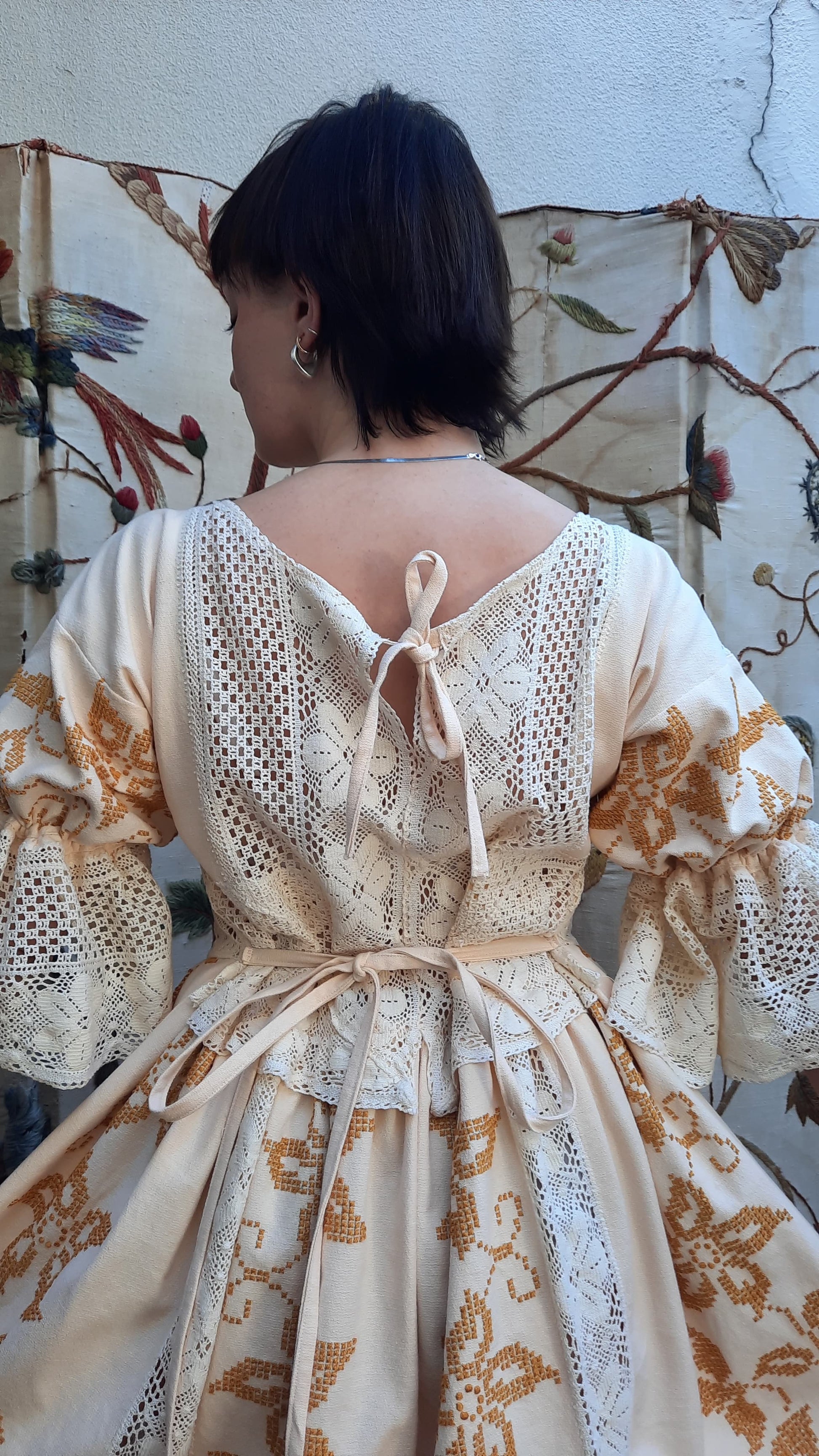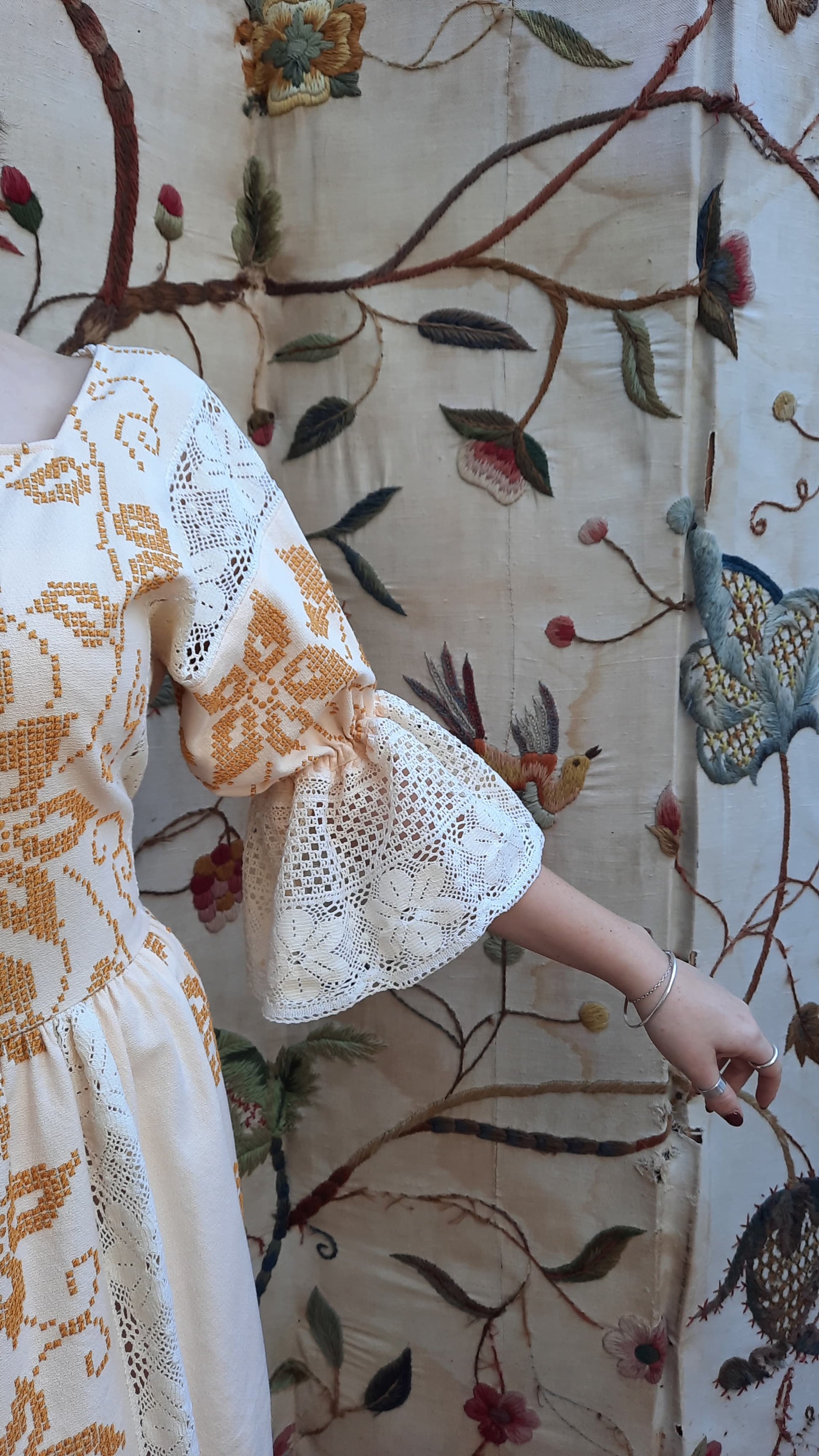 This Faye dress is made from a cotton and linen blend tablecloth that is hand embroidered with cross stitch and put together with torsion lacework.