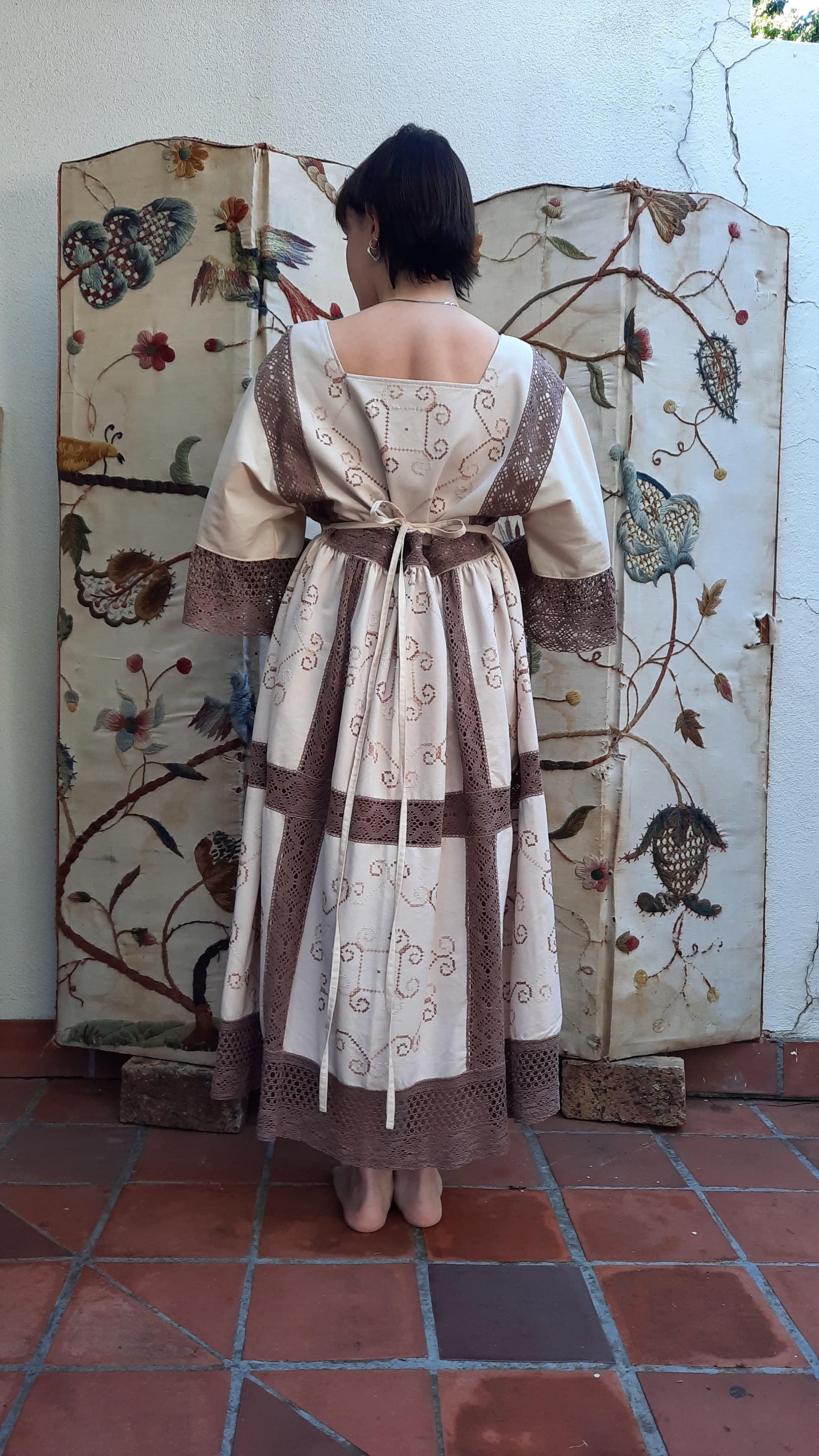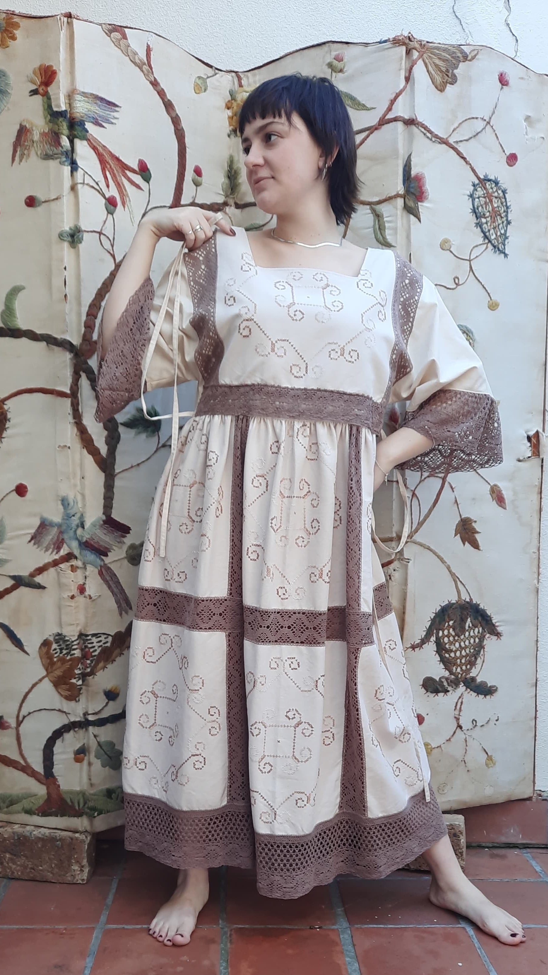 This Faye dress is made from a cotton and linen blend tablecloth that is hand embroidered with cross stitch and put together with torsion lacework.