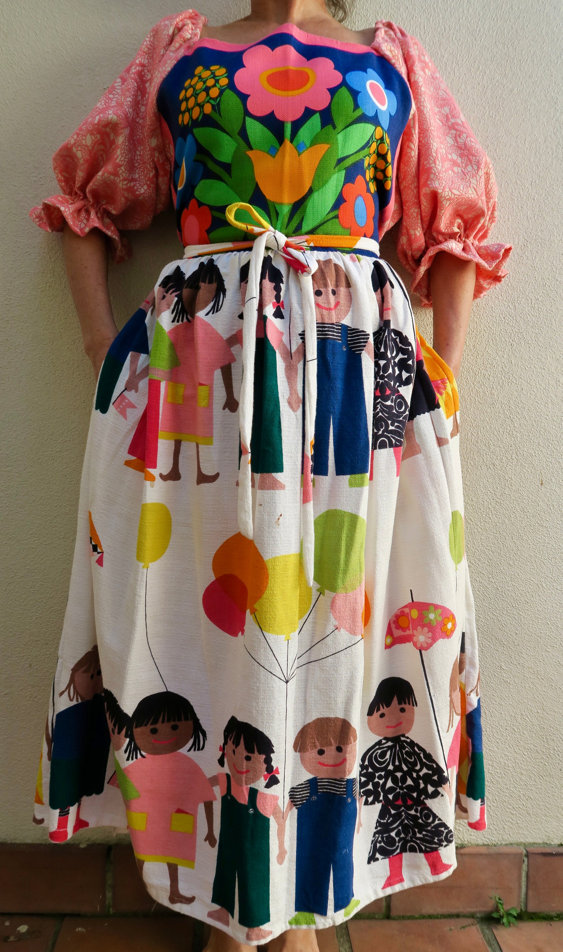 This 'Pick-a-Mix' dress radiates childlike joy! Her bodice is made up of a linen tea towel and the skirt a soft, medium weight curtain. She also has fun pink embossed on cream cotton puff sleeves.
