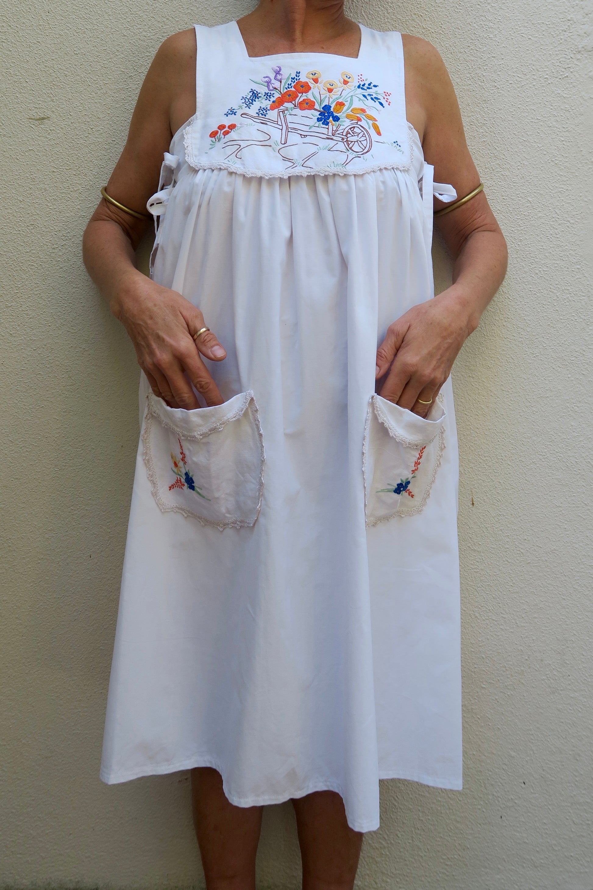 The Wheelbarrow Milkmaid dress is made from 100% Egyptian cotton sheeting and an embroidered doily with crochet edge. She also has two embroidered front pockets and cotton ties under the arms.